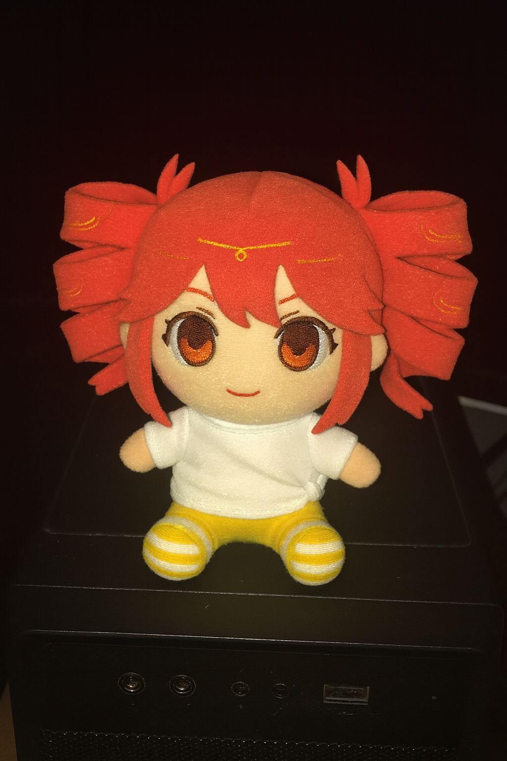 A cute and chibi-style plush doll, similar to a 'fumo fumo' doll, featuring [캐릭터 이름]. The doll has a soft, huggable texture with simplified, rounded features. It should capture the essence of the character's design, including their distinctive [hair color and style, eye color, outfit details like main colors, specific accessories, or unique clothing elements]. The overall aesthetic should be charming and slightly exaggerated, characteristic of collectible plush figures. The doll is sitting upright, with small, stitched details for the face and clothing. Focus on a clean, isolated background to highlight the doll.